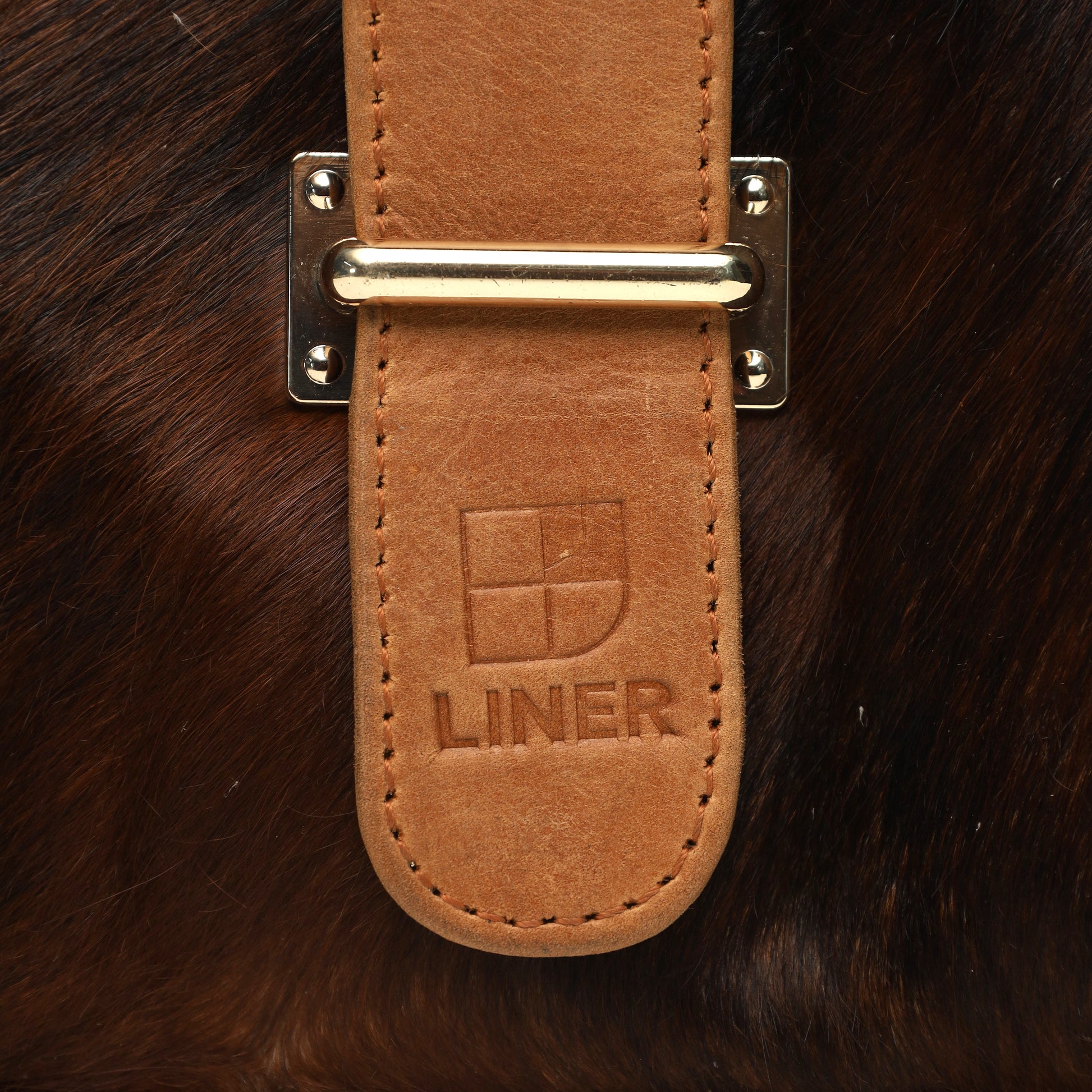 This image features a stylish brown handbag. The main body of the bag is made from a dark brown, fur-like material, possibly cowhide, while the trim, strap, and a central decorative buckle strap are crafted from lighter brown leather. The bag has a rectangular shape with rounded bottom corners and a zippered closure at the top, along with a front flap secured by a buckle. The brand name "LINER." is visible on the buckle
