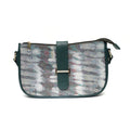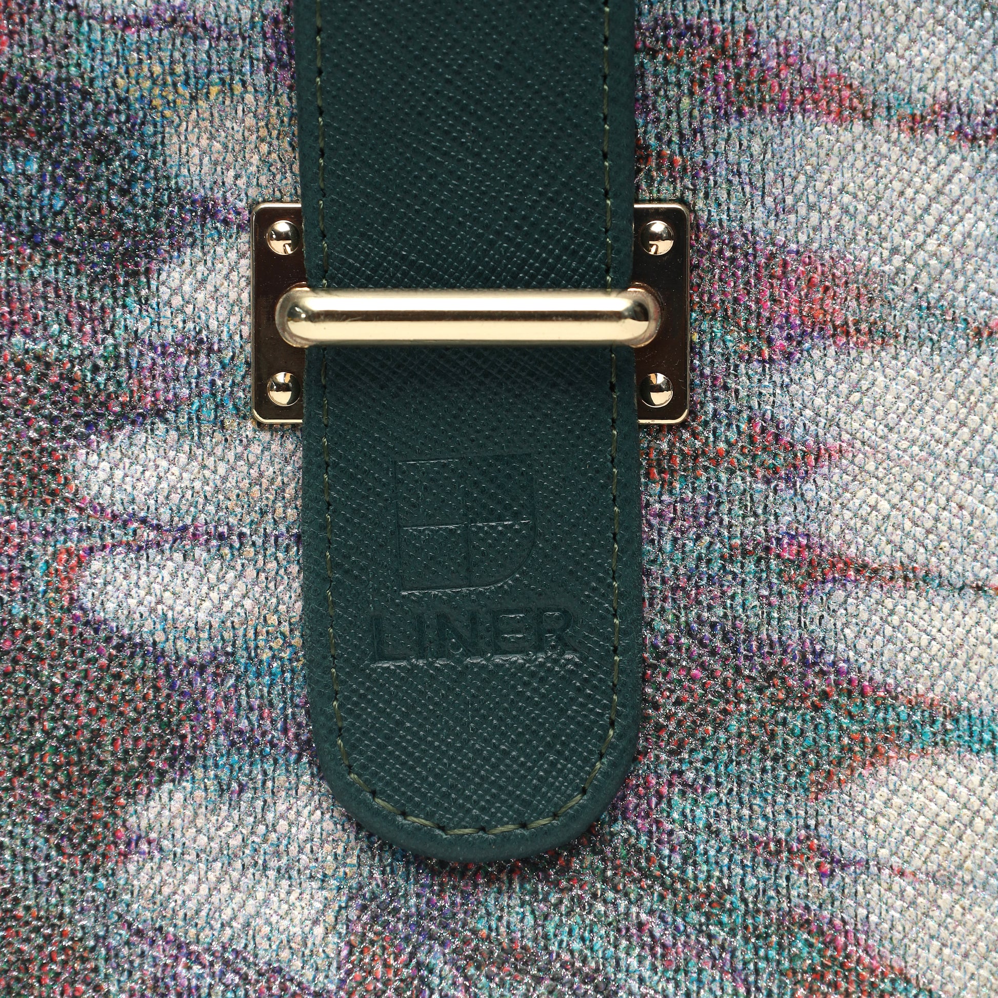 This is a stylish shoulder bag featuring a holographic, multi-toned effect on its main body, providing a shimmering, iridescent appearance. It is accented with a dark green leather trim and a matching strap closure with a gold-toned buckle. The bag has a rounded bottom and a top zipper closure, and it appears to be from the Essentiel - Galaxy" collection.
